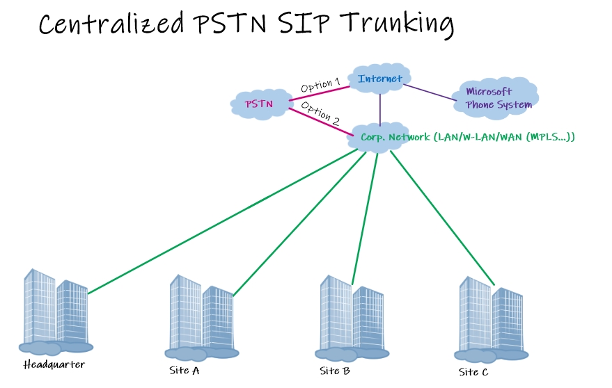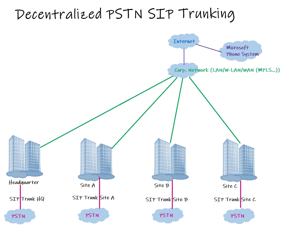 Decentral PSTN SIP Trunk links are one or more sip trunks terminating on a session border controller (SBC, redundant or not redundant) at each location/site. As the above drawing shows each site has its own PSTN link. In my experience many companies have this architecture if …