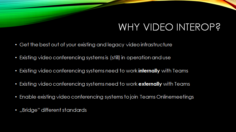 Mostly, companies implement solutions for video interoperability to keep existing investments in dedicated video conferencing infrastructure and connect it to newer communication and collaboration infrastructure. For instance, if you have a dedicated Cisco, Lifesize or Poly video infrastructure you might want to join Teams online meetings with the Cisco/Lifesize/Poly video rooms, too.