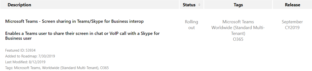 - Microsoft Teams – Screen sharing in Teams/Skype for Business interop [Microsoft 365 roadmap update item 53934]