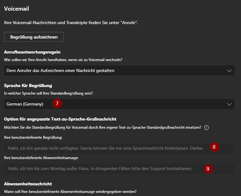 In den Teams Einstellungen sind ein paar sehr praktische Funktionen und Einstellungsoptionen hinzugekommen, so dass jeder Anwender einfach seinen persönlichen Anrufbeantworter bzw. Voicemail konfigurieren kann. Ich habe das mal exemplarisch folgendermaßen eingestellt, womit auch die Einstellungsmöglichkeiten ersichtlich werden.