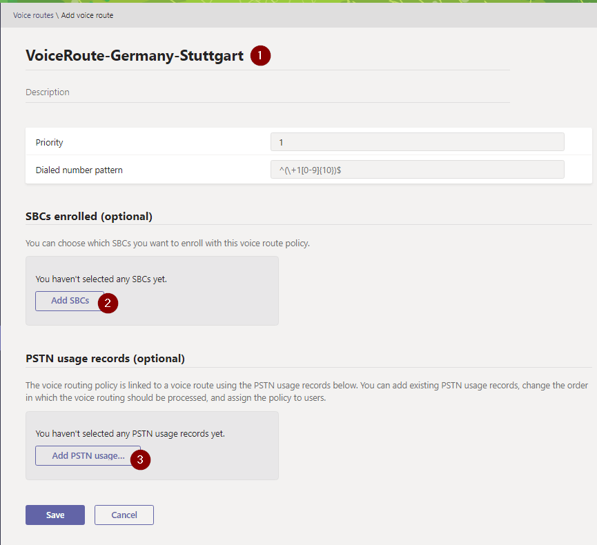 Bei “Dialed number pattern” kann ein bestimmter regulärer Ausdruck via RegEx definiert werden, um basierend von Teams ausgehende Anrufe auf einem bestimmten “Muster” zu prüfen, um hier eine Routing-Entscheidung für diese oder eine mögliche andere Route zu treffen. Ich lasse dies hier mal absichtlich leer. Wenn User komplett E.164 (also mit +49… ) wählen sollen oder einfach alles akzeptiert werden soll, kann hier z. B. .$ (any) o.ä. verwendet werden. Je nach Bedarf.