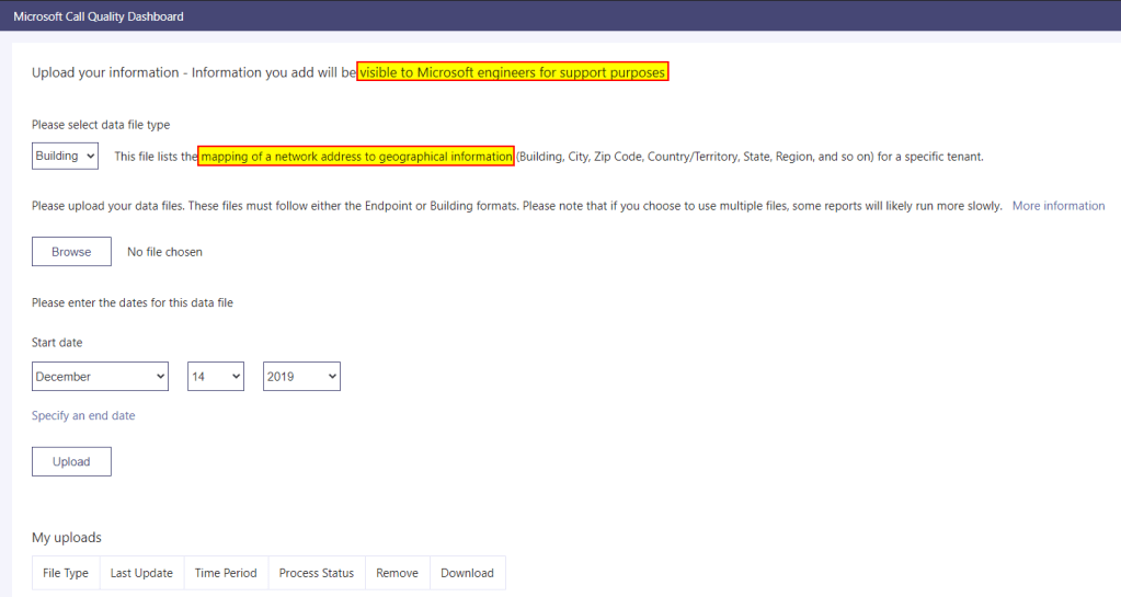In case you need to dig in deep in the depths of the reports you might also want to upload some network details regarding your physical location/s or endpoints. This can help you as well as Microsoft Support to troubleshoot issues, if required. For example, you can upload a CSV including: