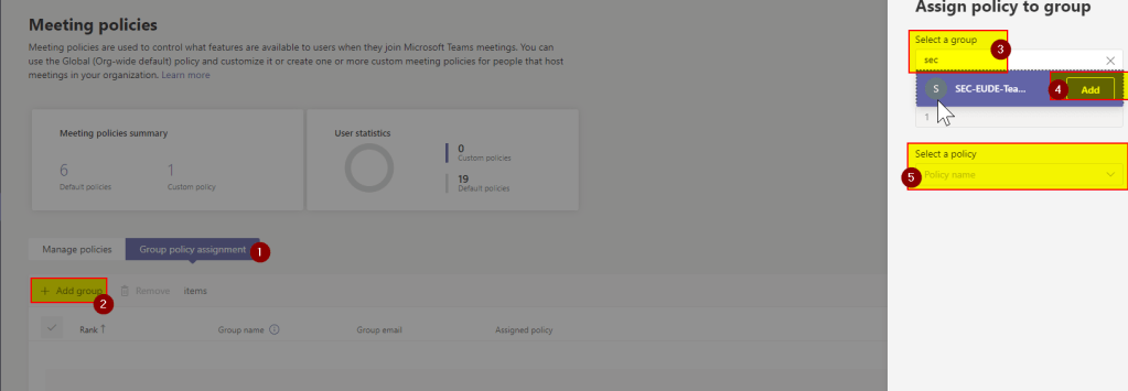 Screenshot – Teams Admin Center \ Meetings \ Meeting policies \ Group policy assignment 2