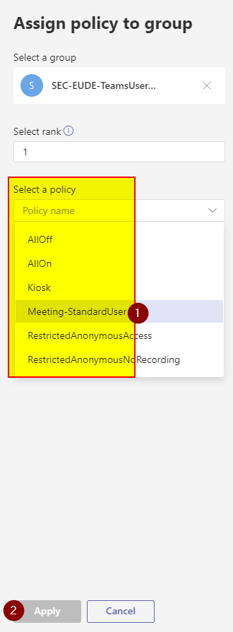 New-CsGroupPolicyAssignment -GroupId <object id of AAD group> -PolicyType TeamsMeetingPolicy -PolicyName "Meeting-StandardUser" -Rank 1