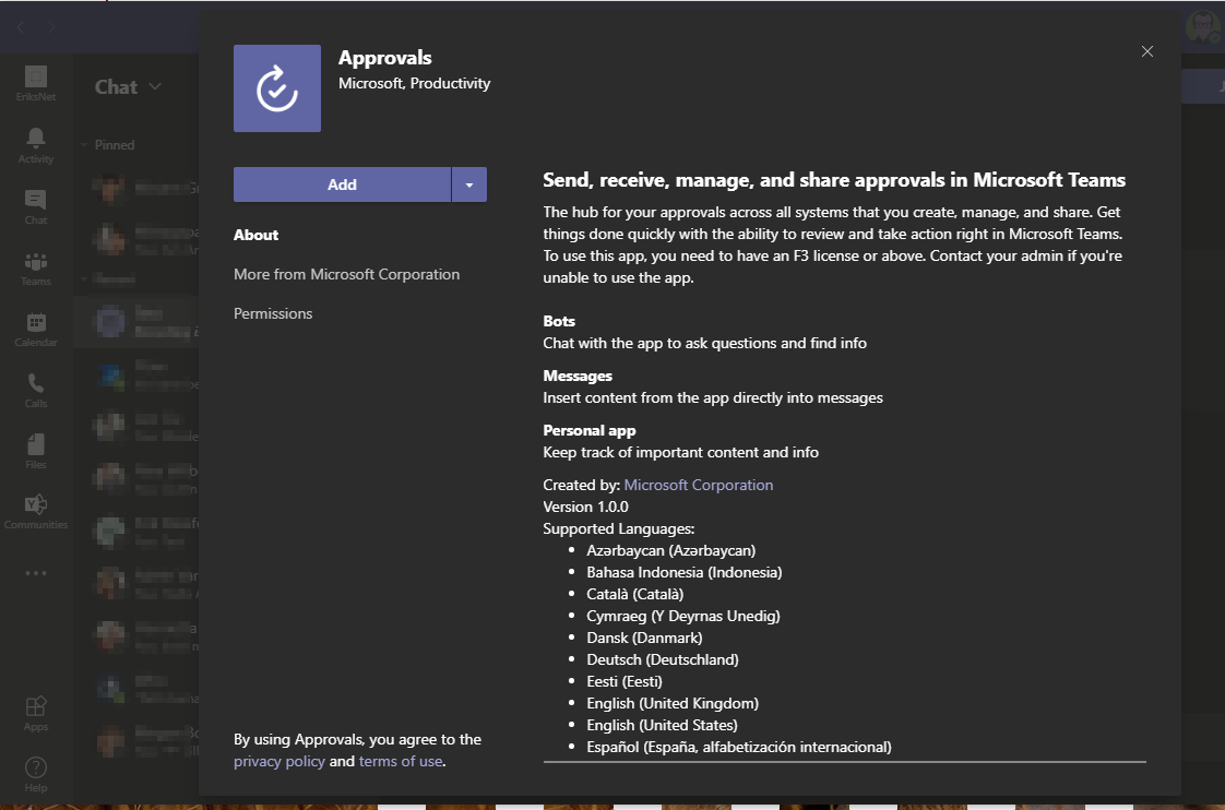 In this post I highlight the approvals app in Microsoft Teams. The app is now generally available from Wednesday, 13th 2021. The app enables you to build, manage and view approvals centrally in Microsoft Teams. You can directly create new approval requests within the approvals app or see other approval processes in which you are involved. The app can be installed using the Teams app store if your Teams app permission policies are permit it.