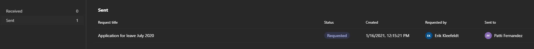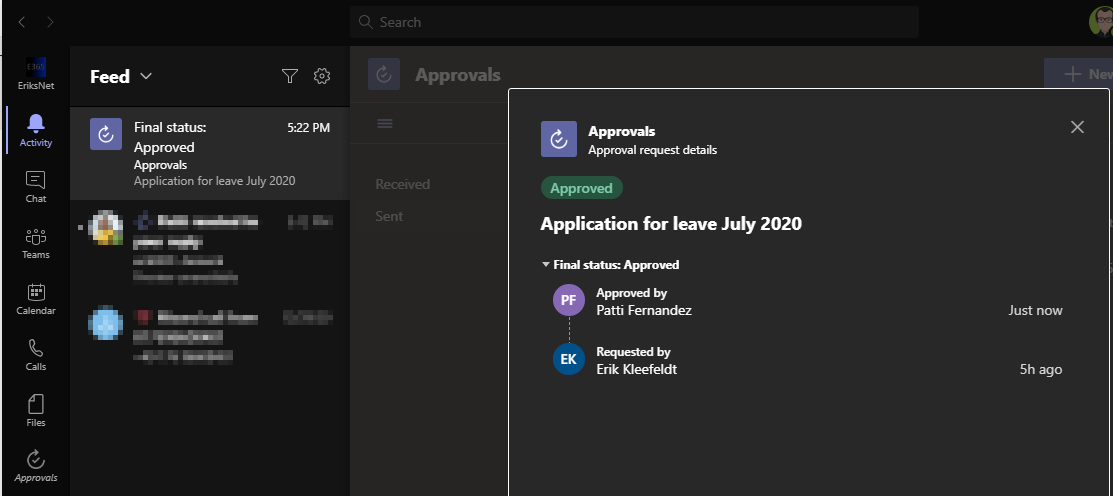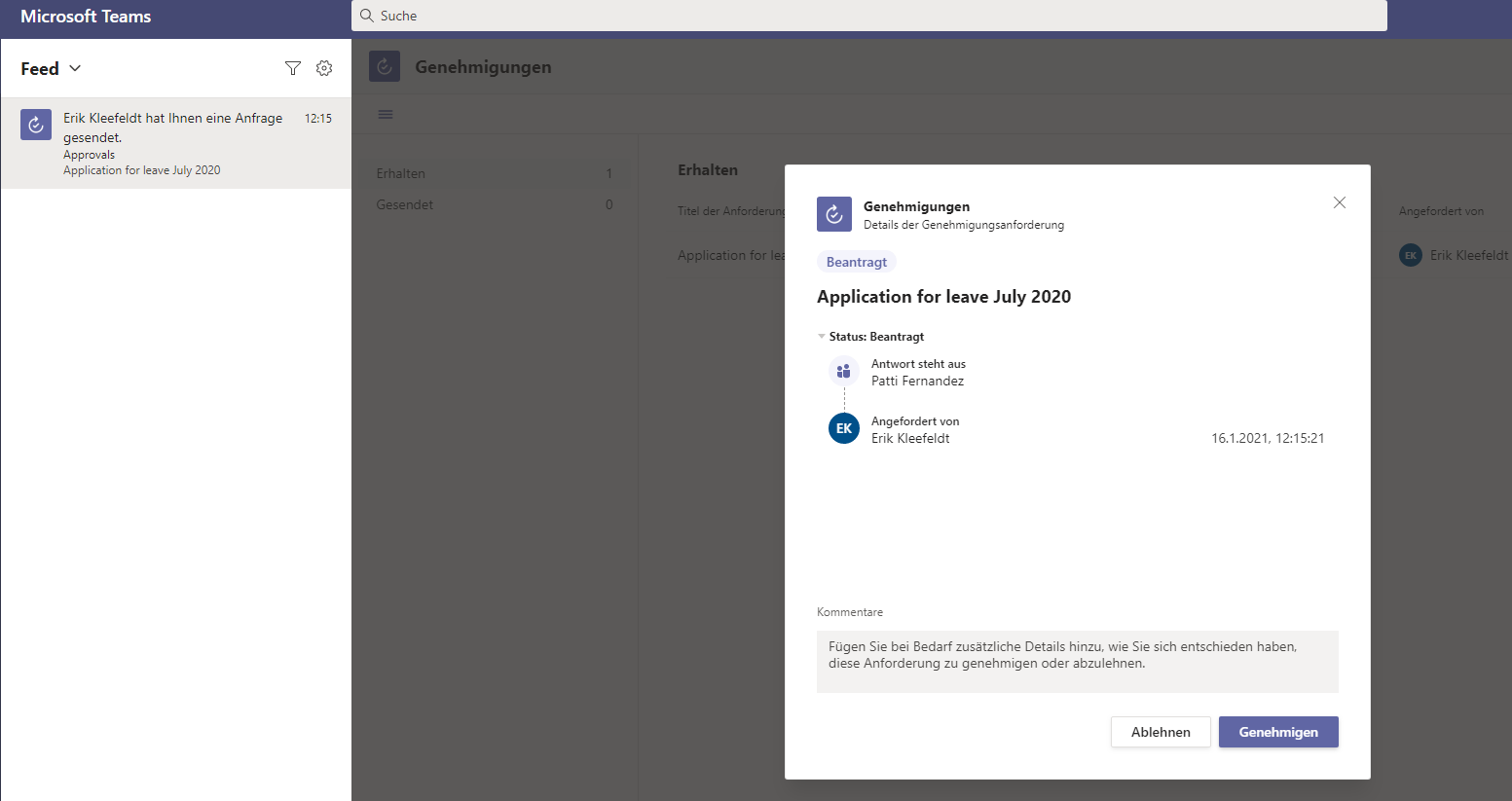 On the other side the approver gets an activity in her feed to approve or decline the request.