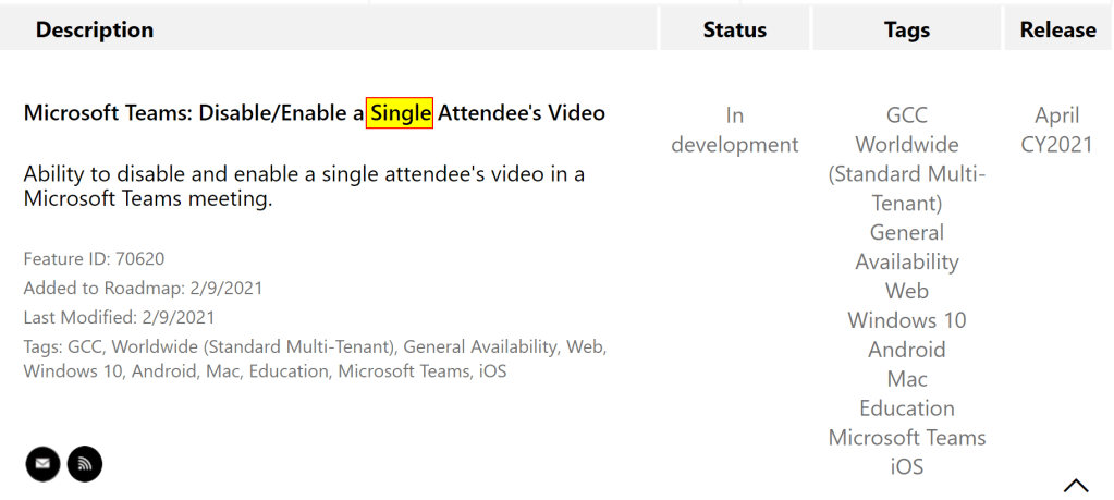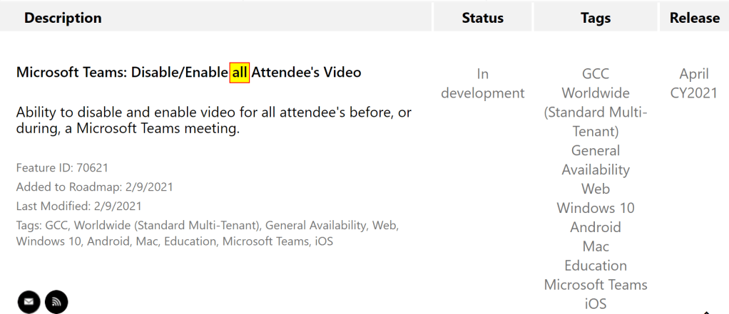 We already know the feature to unmute all or single attendee’s audio. This helps to reduce distraction and noise in meetings which are intendend to be more like live events but with options for interaction at the end of the meeting’s session or event. The following screenshots of the roadmap show that this is planned for April 2021 to be available for attendee’s video, too! I.e. you then will be able to disable or enable attendee’s video either for a single attendee or all attendee’s.