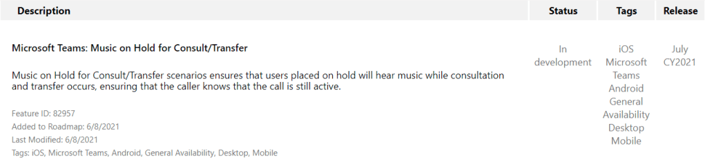 This is post is about music on hold (MoH) in Microsoft Teams for call transfers with and without previous consultation. Today, if you answer a (PSTN) call in Microsoft Teams which you want to transfer with or without asking the person to whom you want to transfer the call, you don’t get MoH. This can be awkward especially if the caller you are about to transfer or transfering does not hear anything, silence. That’s bad and could make the caller think that the line is dead which makes him cancel the call although SIP (signaling) and the call is technically alright. I’m glad to read the Microsoft 365 roadmap feature ID 82957 which says that we will get MoH for both (non-)consultative call transfers in Microsoft Teams. Yay. The recent roadmap [July 1, 2021] states that the rollout is scheduled for July 2021.