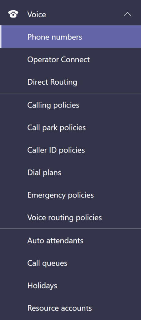 In the Voice space we now have everything we need in one space after expanding it: Phone numbers, Operator Connect, Direct Routing, Calling policies, Call park policies, Caller ID policies, Dial plans, Emergency policies, Voice Routing policies, Auto Attendants, Call Queues, Holidays and Resource accounts.