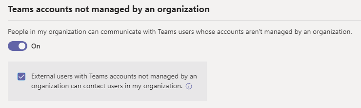 • Enable/disable People in my organization can communicate with Teams users whose accounts aren’t managed by an organization.
