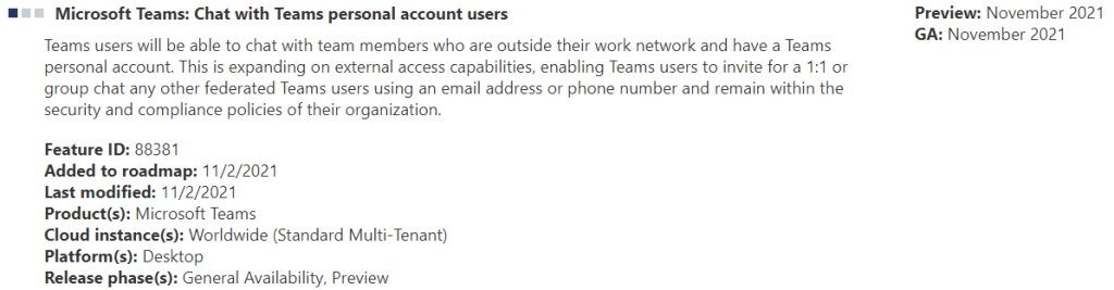 A recent Microsoft 365 message center notification MC296208 announced the general availability (GA) of Chat with users with Teams personal accounts.