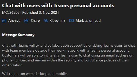 Source: Microsoft 365 Message Center – Chat with users with Teams personal accounts MC296208