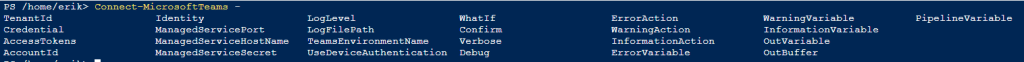 Let’s run “Disconnect-MicrosoftTeams”, try to re-connect with parameters but which ones?