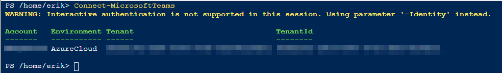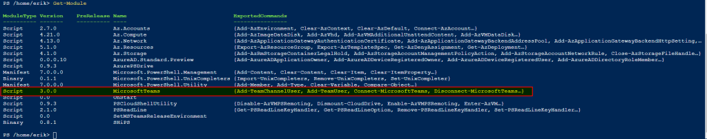 Haha, good one: I’m in the TAC, authenticated and authorized as Teams Admin but the Teams Cloud Shell wants me to run “Connect-MicrosoftTeams” as I would do on any other “remote” system, e.g. my notebook. Alright, let’s do what we have to. But let’s check for the Teams module, just because I’m curious.