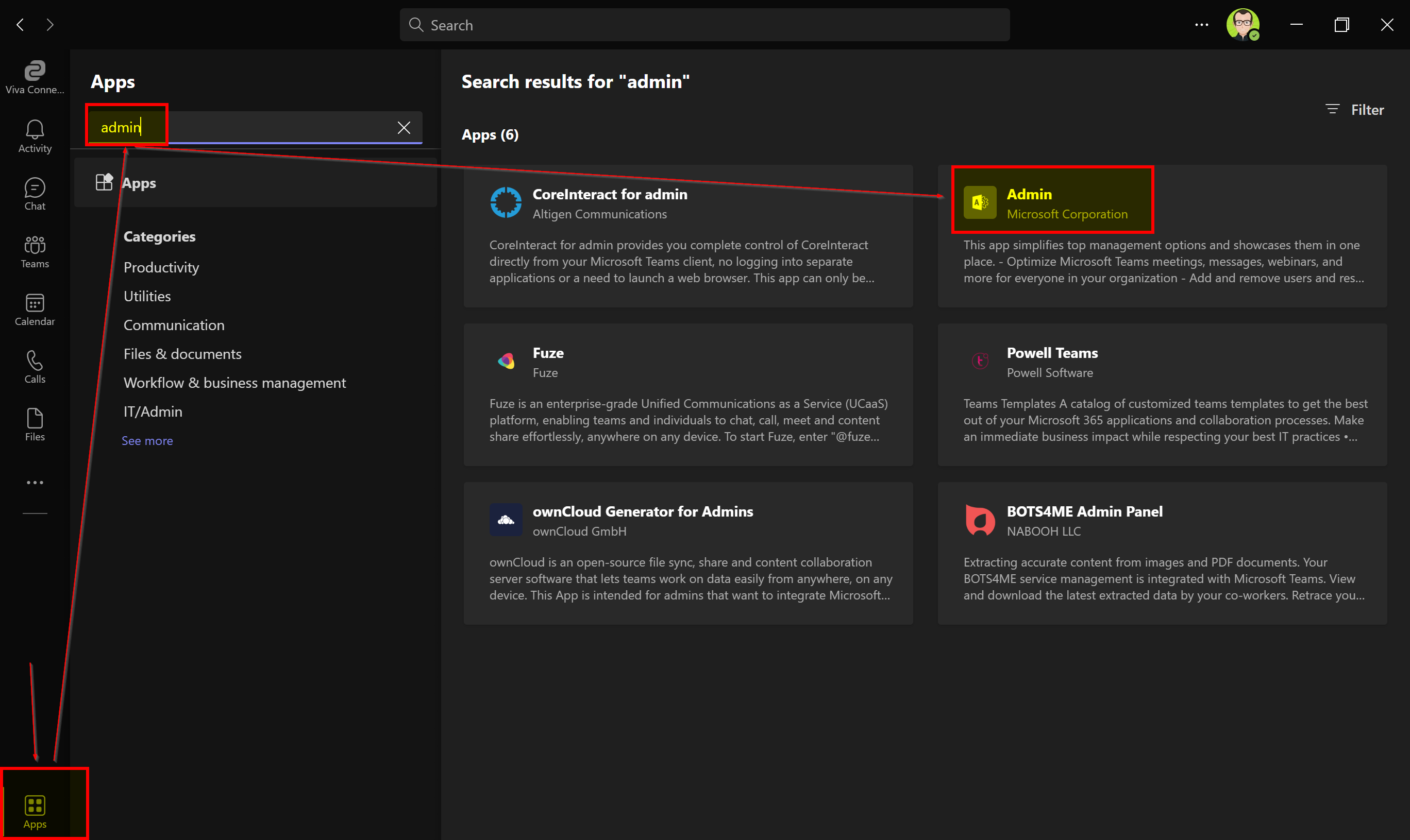 Microsoft is also adding further apps to the Teams app store, e.g. the Admin app which I will show a little bit hereinafter. The app is primarily for Teams Admins and provides some capabilities. I would say it is some kind of quick access to accomplish some administrative tasks.