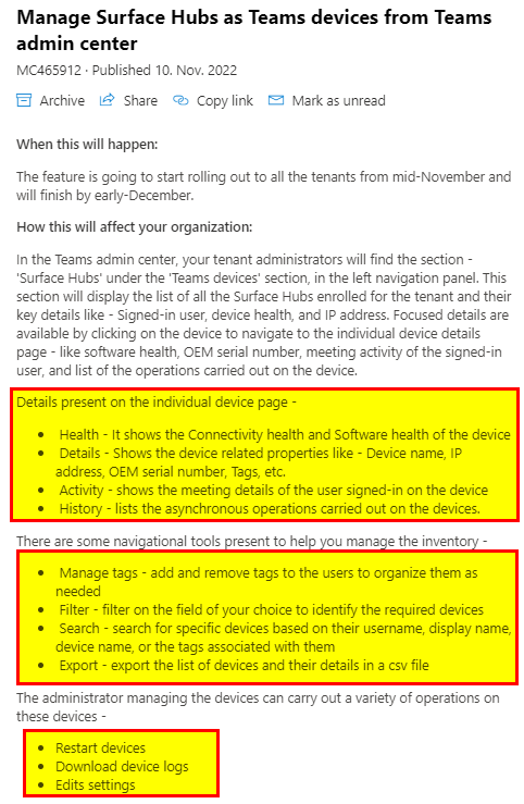 - Microsoft 365 MC465912 Manage Surface Hubs as Teams devices from Teams admin center