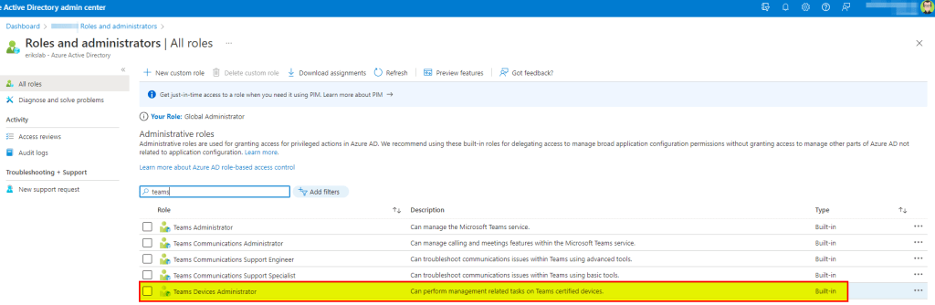 Managing Teams devices within the TAC is comfortable as well as secure in regards of permissions. For some time now, you can configure more precise administrative permissions for Teams device admins due to the fact that there is a new role available, called Teams Devices Administrator (see screenshot below).