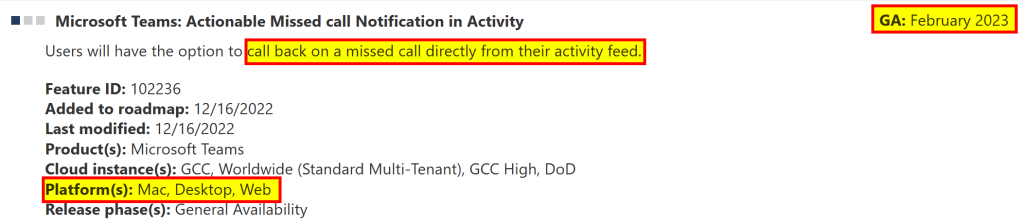 Microsoft is bringing a calling feature or shortcut to Microsoft Teams in order to quickly make an call based on missed calls in the activity feed based on Microsoft’s 365 roadmap feature ID 102236. The feature’s release (general availability, GA) is planned for February 2023 on Mac, Desktop and web.