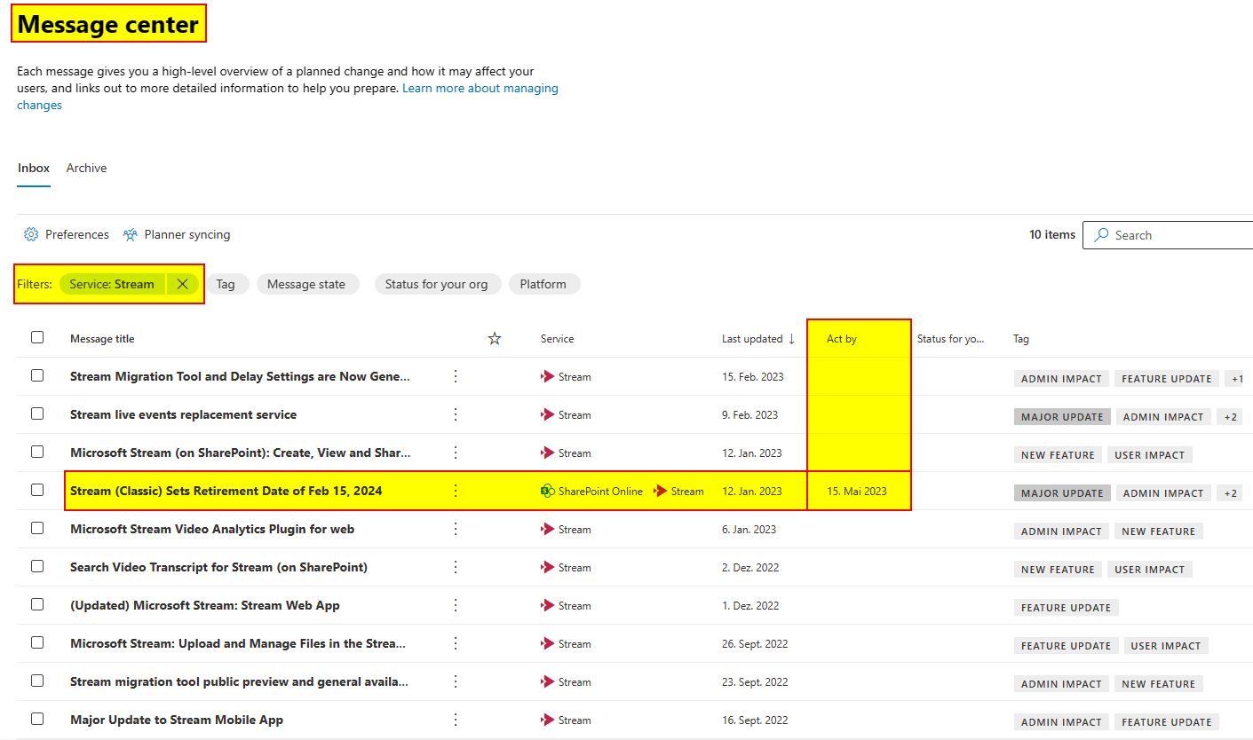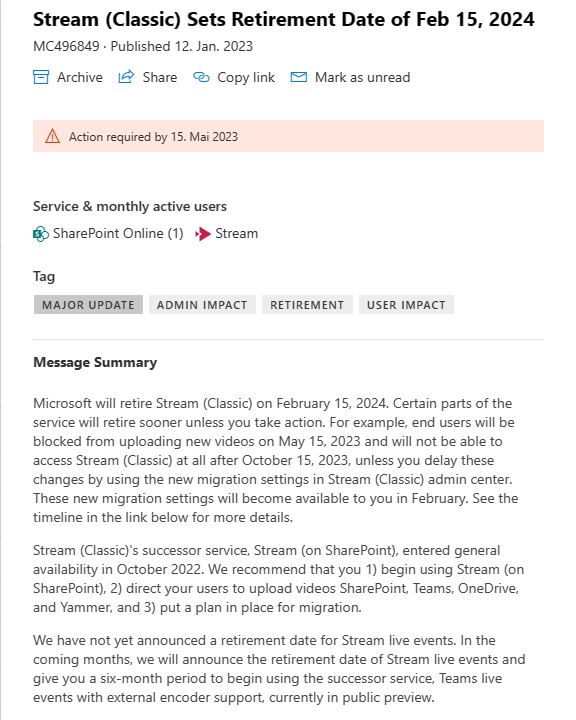 As you might have read Microsoft enhances Stream by better integrating it into Microsoft 365. Stream classic is not that seamlessly integrated in Microsoft 365. That’s what’s being changed by the transition from Stream classic to Stream on SharePoint. First of all, complete Stream classic will be retired on February 15, 2024 and certain components even earlier based on Microsoft’s 365 message center notification MC496849. Beginning on May 15, 2023 users will not be able to upload new videos to Stream (Classic) except you delay this change.