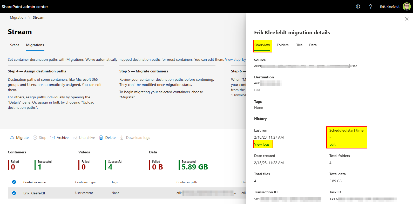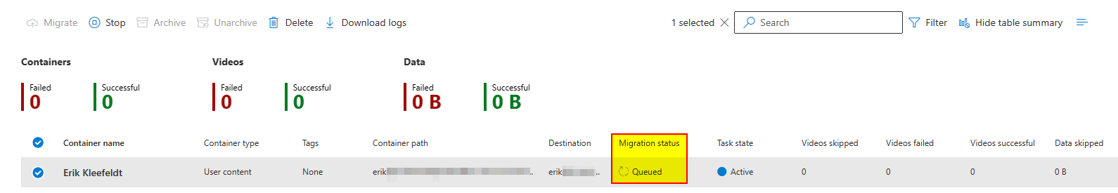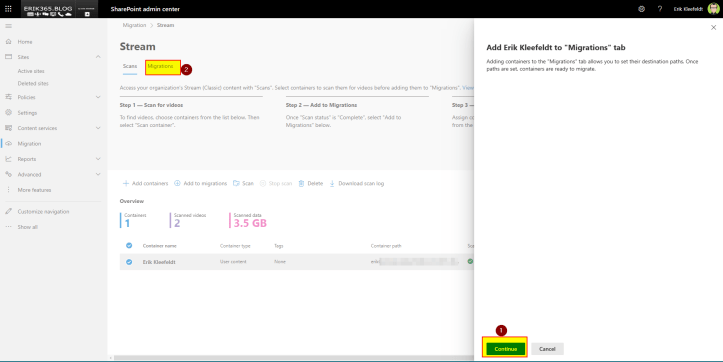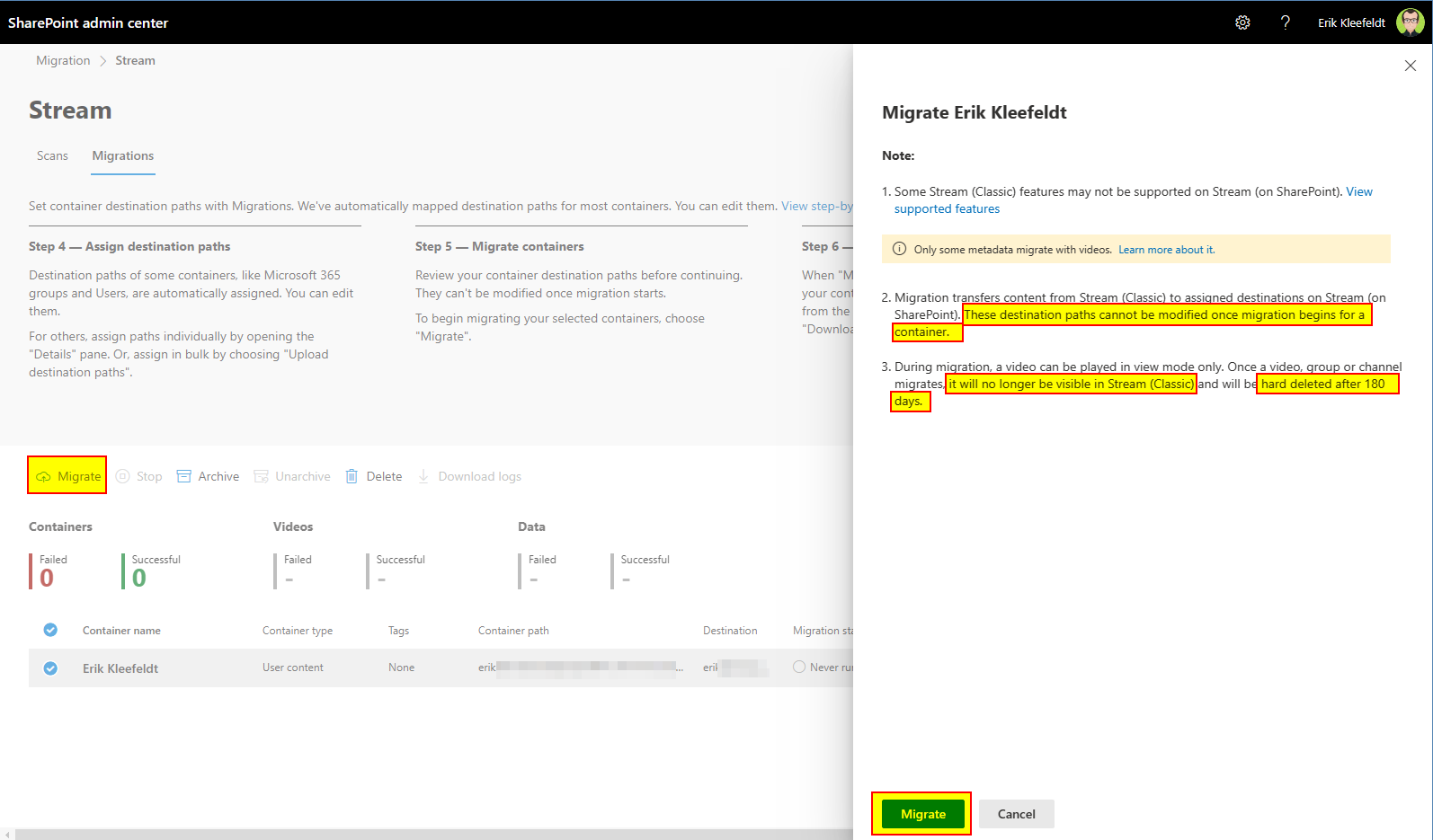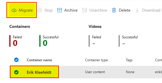 - A container “Erik Kleefeldt” can be selected and added to migration