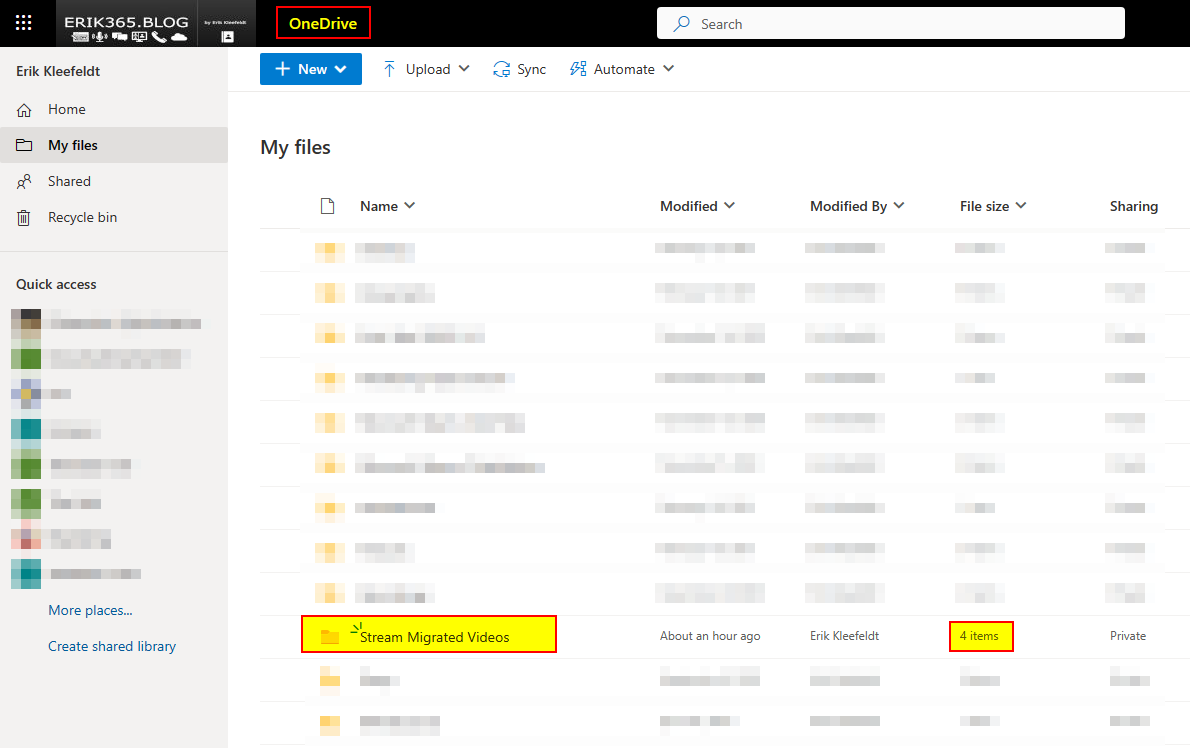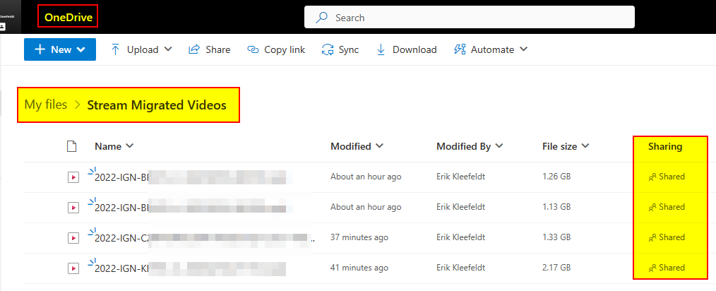 - The videos are stored on OneDrive in a new folder called Stream Migrated Videos.