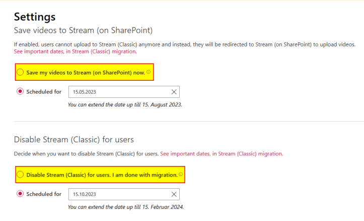 Please note, that you might should consider a different approach in case you have to migrate many videos from Stream (Classic). Also, you might not want to disable Stream (Classic) right away, as I do hereinafter, you might better only disable the option to save or upload videos on Stream (Classic) and decide later (after content migration) on disabling the Stream (Classic) user access.