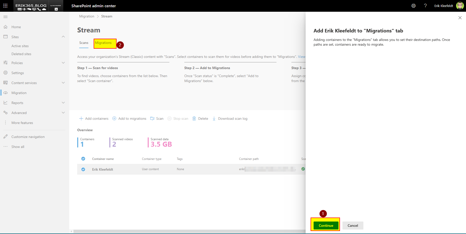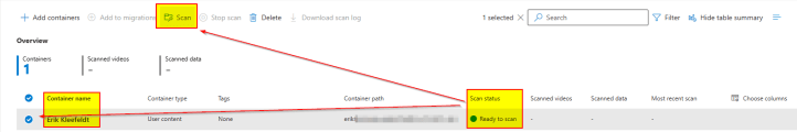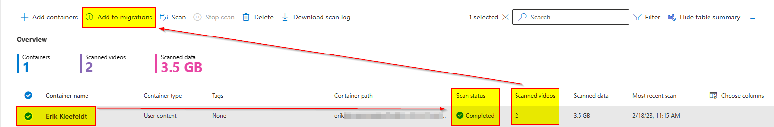 - On the scan tab we add the “Erik Kleefeldt” container to the migration