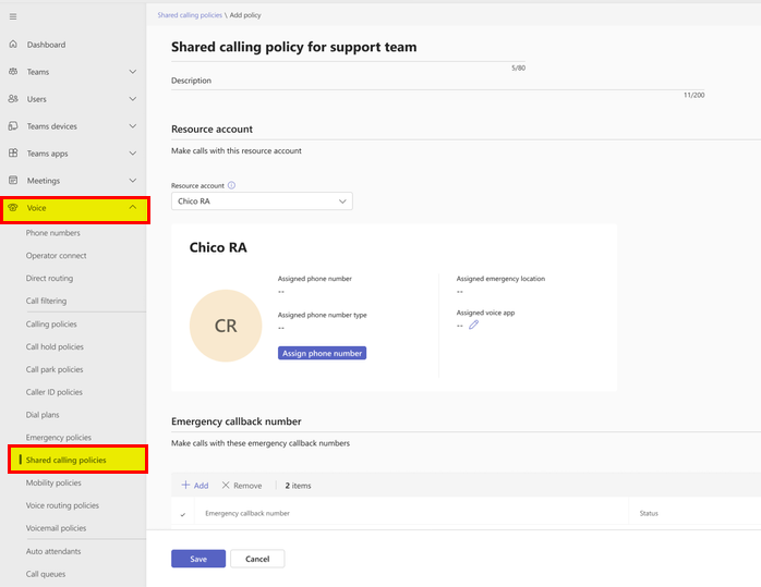 Users cannot set this up themselves. A Teams administrator has to create a Shared calling policies in the Teams Admin Center (TAC) and assign it to the group of people. First, like you might know from creating call queues and auto attendants in TAC, a resource account has to be created. The resource account must be licensed and requires a phone number.