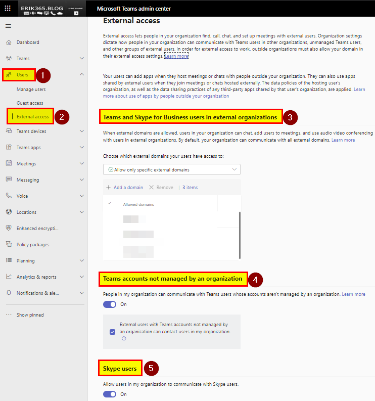 Another option is to use external access (federation) in Microsoft Teams. I do not really like the feature name “external access” because it suggests more as it actually is, in my opinion. However, this allows you to communicate with external users who are using Teams (or Skype for Business) in other organizations. External access is ideal for scenarios where you need to have one-to-one chats, group chat (not SFB) or calls with external contacts, without inviting them to your tenant and team. You can manage external access at the tenant level, and choose which domains you want to allow or block.