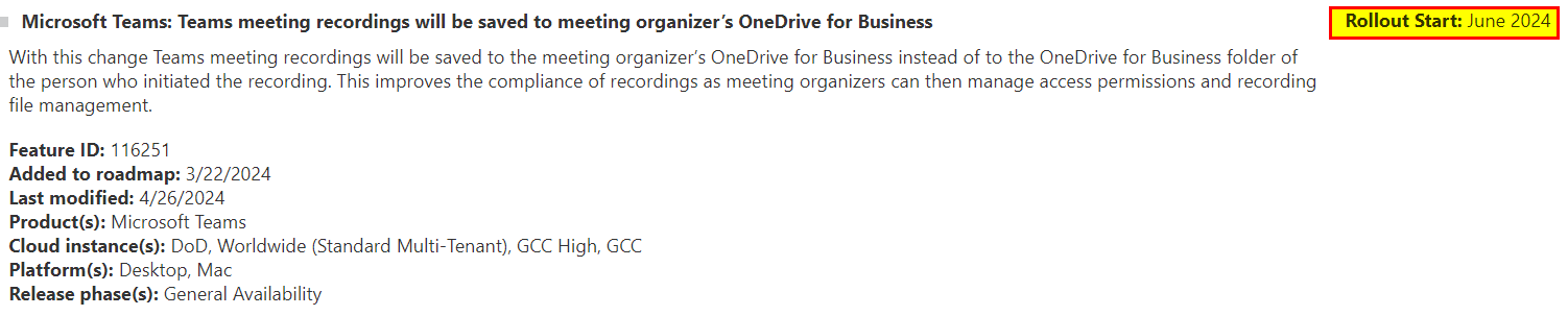 - Microsoft 365 Message Center ID MC772558 – Microsoft Teams: Meeting recordings are now saved in organizer’s Microsoft OneDrive