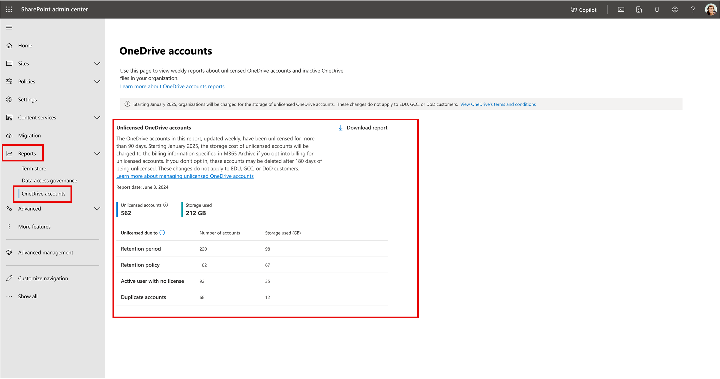 - Review accounts: Use the new reporting tools to check the status of unlicensed OneDrive accounts.