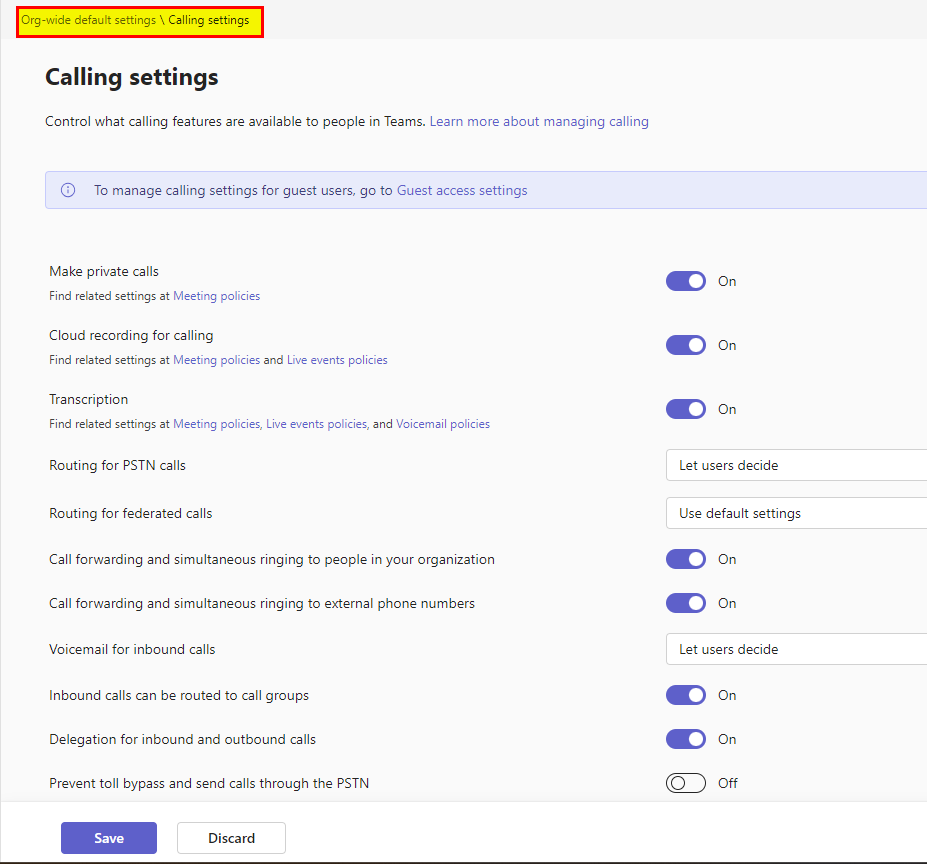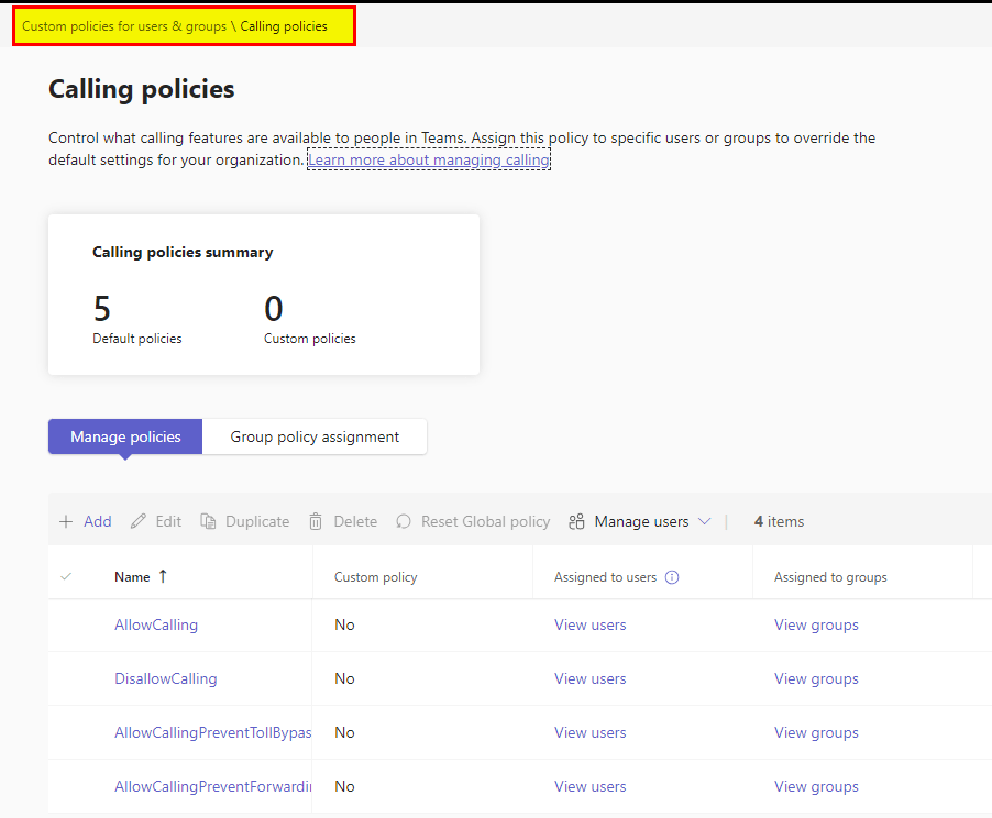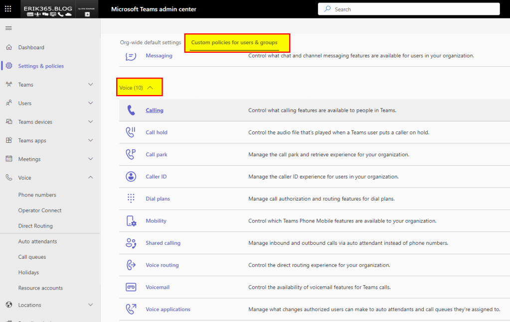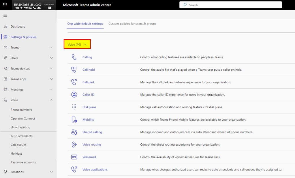All global and org-wide polices can be found in the first subsection, e.g. the ones for voice. As depicted in the next screenshot.