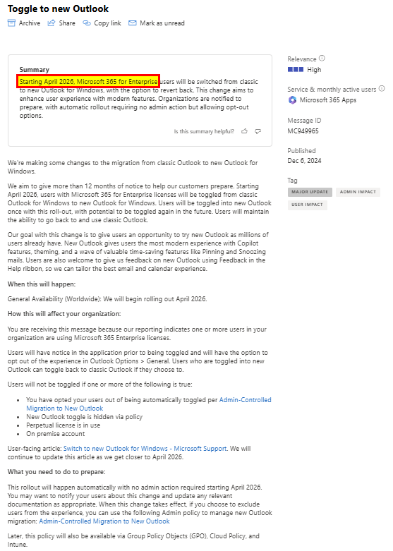 For Microsoft 365 for Enterprise users the switch will start in April 2026 (screenshot below) but Microsoft 365 for Business users will expierience the switch to the new Outlook starting this month.