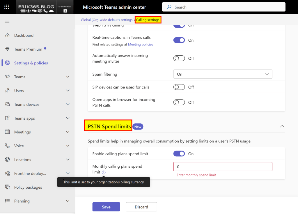In this post I like to highlight that a new configuration option for calling plans appeared in the Microsoft Teams Admin Center. To be more precise, in the calling policies. As you can see in the screenshot below [May 2025]: Now you can configure PSTN Spend limits to set a monthly limit the overall consumption – and costs – for making PSTN calls beyond the included calling plan amount.