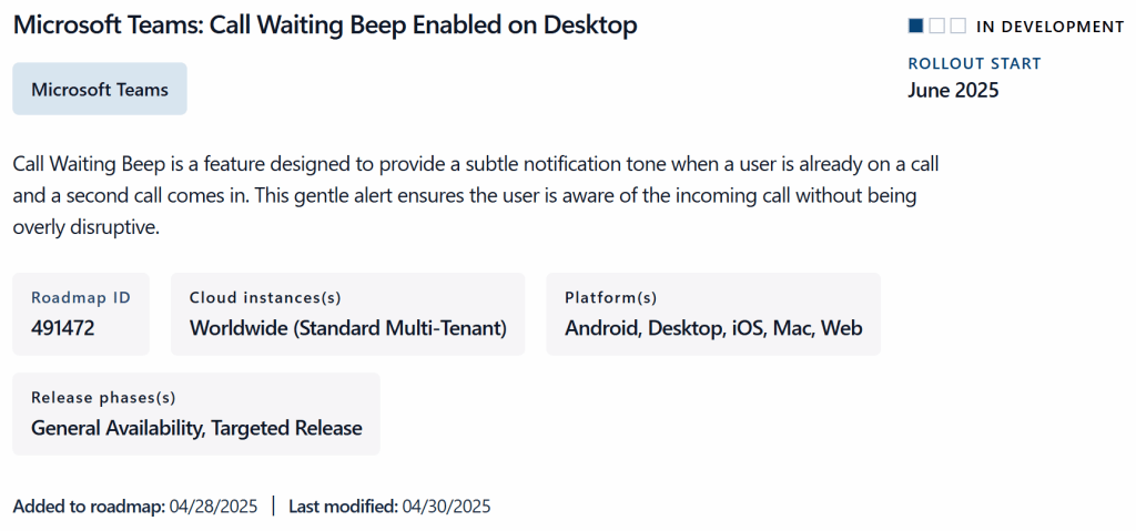 Microsoft announced an audio indicator for another incoming voice call so that you are going to know that there is another (second) caller waiting for you to answer a call. In the current roadmap it is said that the beep is a soft tone in order not to disrupt or disturb to intense. The feature is planned to be rolled out starting from June 2025 onwards.