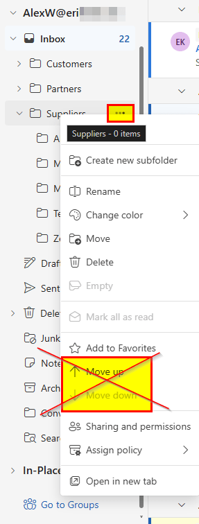 At first, I tried the usual trick: right-clicking the parent folder and looking for a “Sort Subfolders” option. No luck! This feature wasn’t available in the new Outlook client. After some research, I stumbled across several (older) forum posts claiming that folder sorting in modern Outlook still wasn’t supported, and manual rearranging was the only workaround.