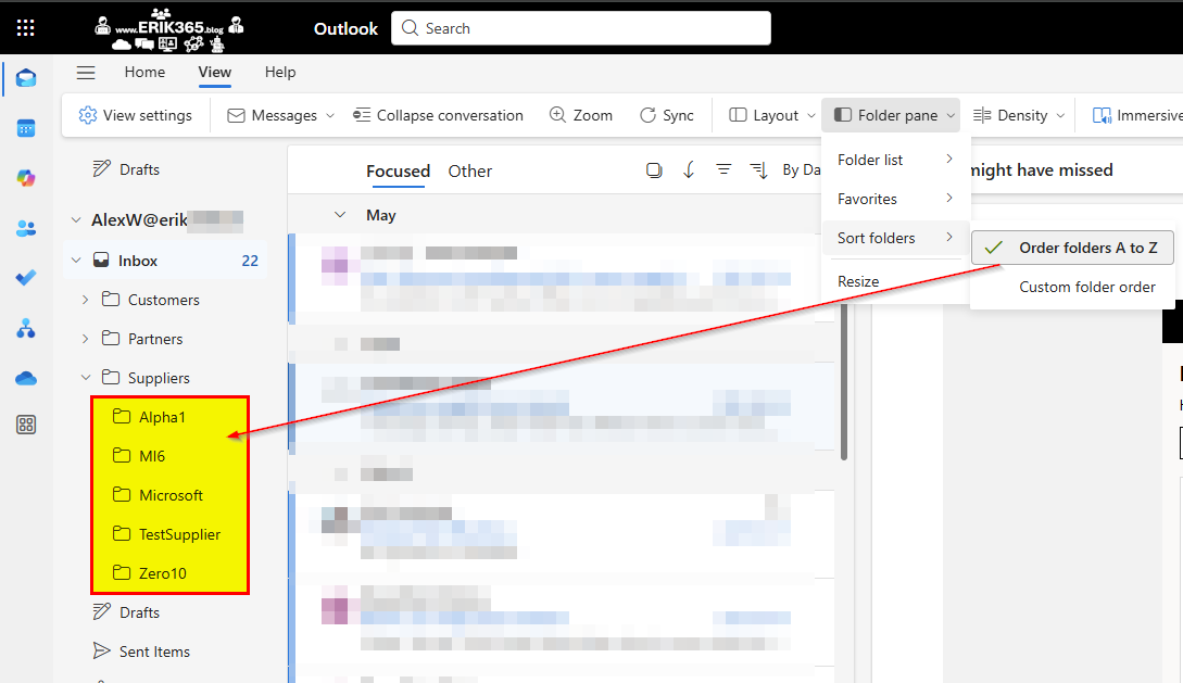 If you’ve switched to the new Microsoft Outlook experience and noticed your folder organization behaving strangely – you’re not alone. I recently noticed that a custom folder order had silently taken over my Outlook layout. Each new subfolder I created, even within existing folders like “Suppliers,” would appear at the very top of the list, ignoring alphabetical order. For instance, a folder starting with “M” wasn’t landing mid-list as expected. It was jumping straight to the top.