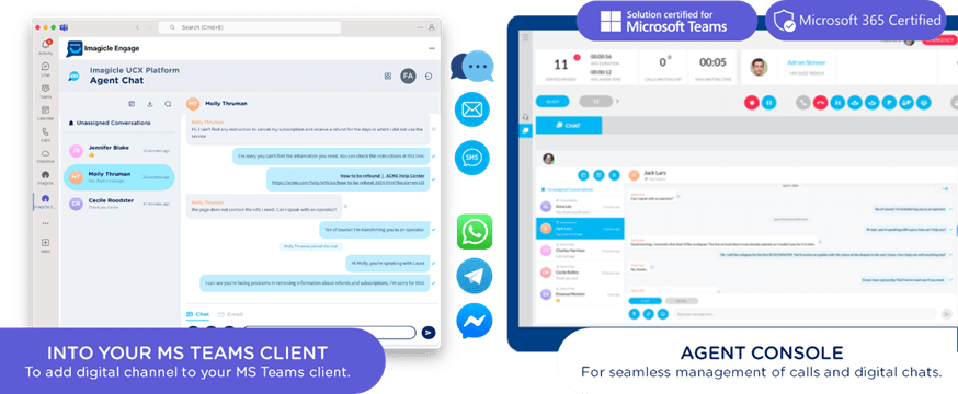Imagicle offers two different agent workspaces to choose from: a lite console integrated into the Teams client to add digital channels to it, and a thick client allowing to manage voice calls, chat, email, SMS, and even social media from a single console