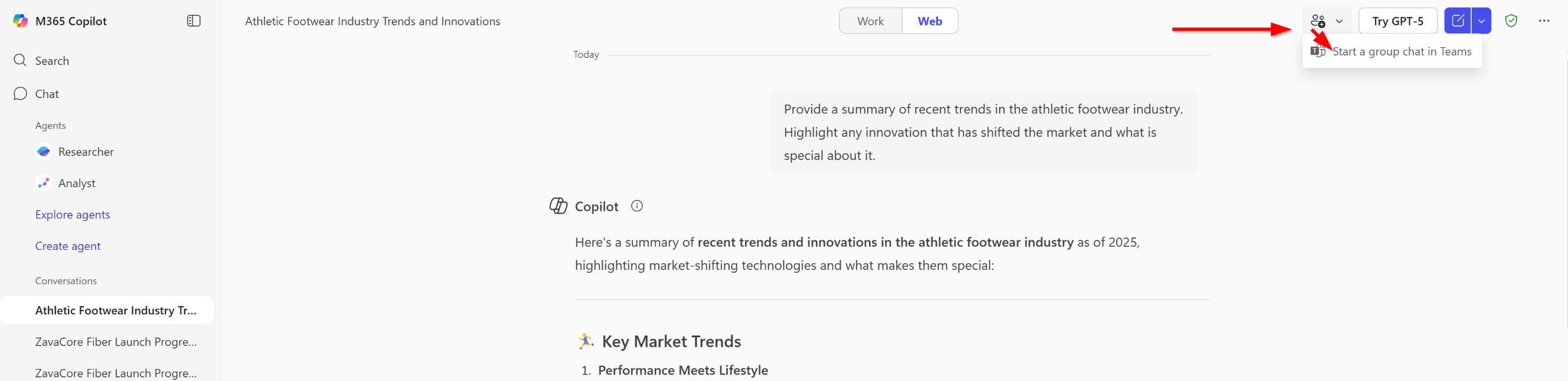 - Ask Copilot for summaries, comparisons, or creative input directly in the team conversation.