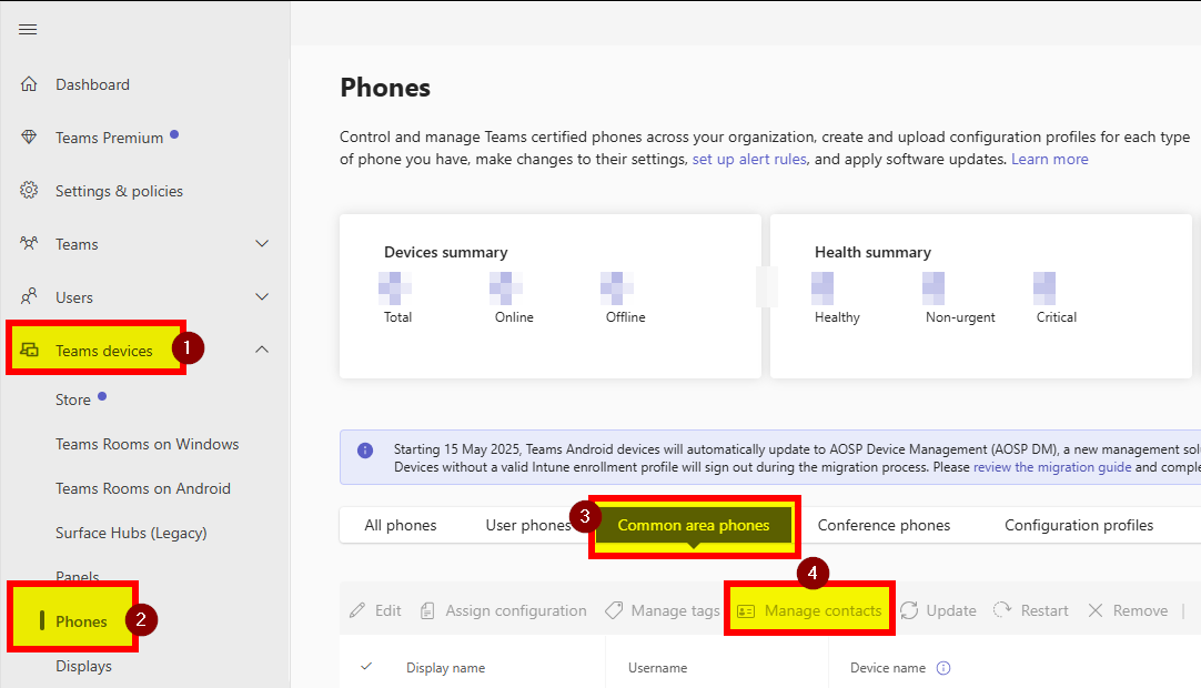 - Navigate to Teams devices \ Phones \ Common area phones.