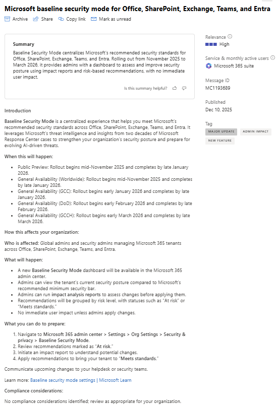 Importantly, there is no immediate user impact unless admins decide to apply changes. Furthermore, the message center message says that no specific compliance considerations for Baseline Security Mode has been identified. However, organizations should still review the feature in the context of their own compliance requirements.