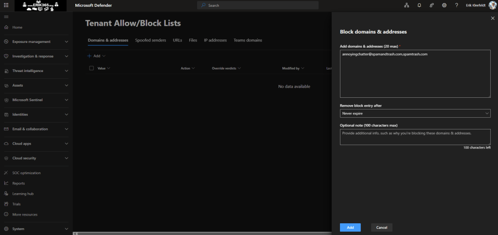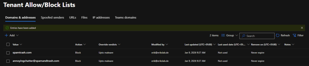 By turning this on blocked domains and users from the Defender for Office 365 configuration are applied (after approx. 24 hours). Currently the documentation says that 4000 domains are the maximum to be blocked. The Tenant-wide allow and block list is used for this: https://security.microsoft.com/tenantAllowBlockList