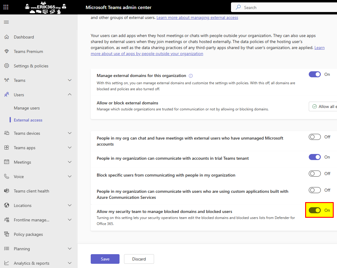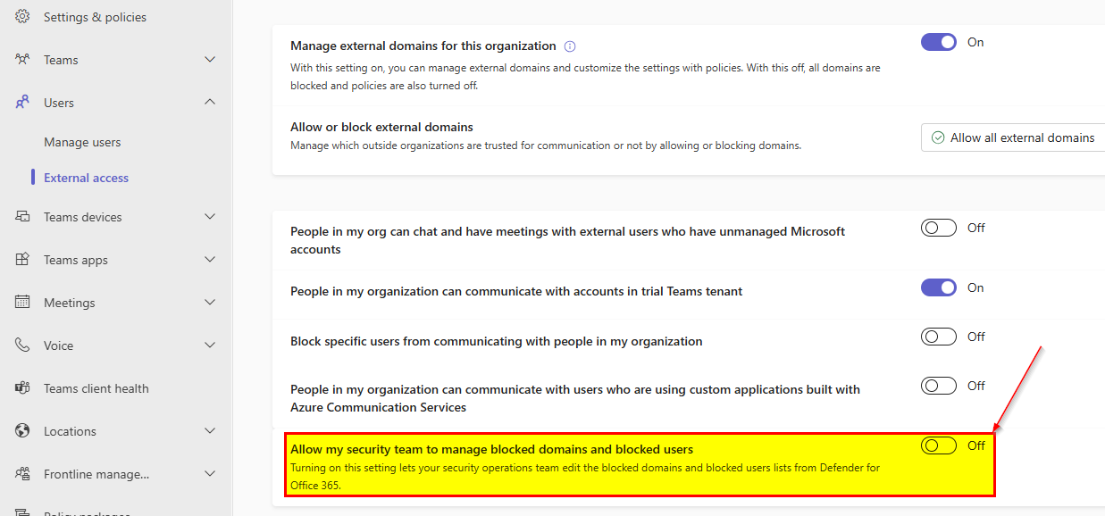 In this post I like to point out a nice capability to manage blocked domains and users for Microsoft Teams External Access (~federated, external chats). The last months there were several changes implemented to Microsoft Teams External Access allowing Teams and Security Admins to make more granular configurations. One of these is called “Allow my security team to manage blocked domains and blocked users” in the External Access section of the Teams Admin Center. This enable Teams Admins to delegate the management of blocked domains and users to Security Admins who are in control of the Defender for Office 365 configuration and operations.