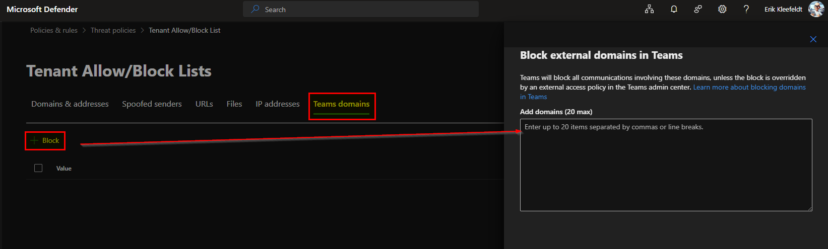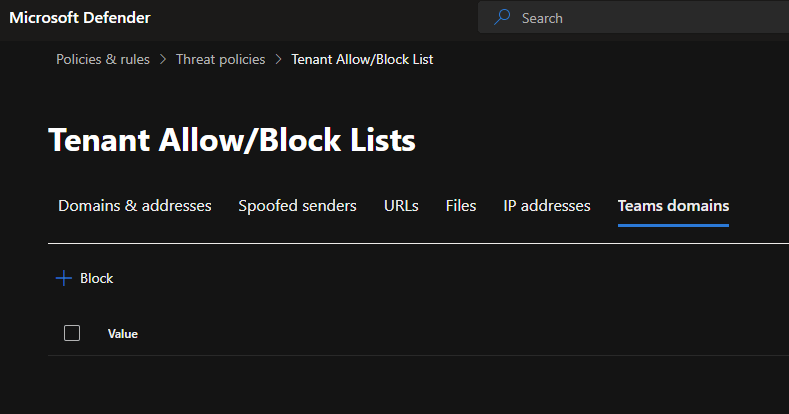 - Block domains and addresses in Microsoft Teams using the Tenant Allow/Block List – Microsoft Defender for Office 365 | Microsoft Learn