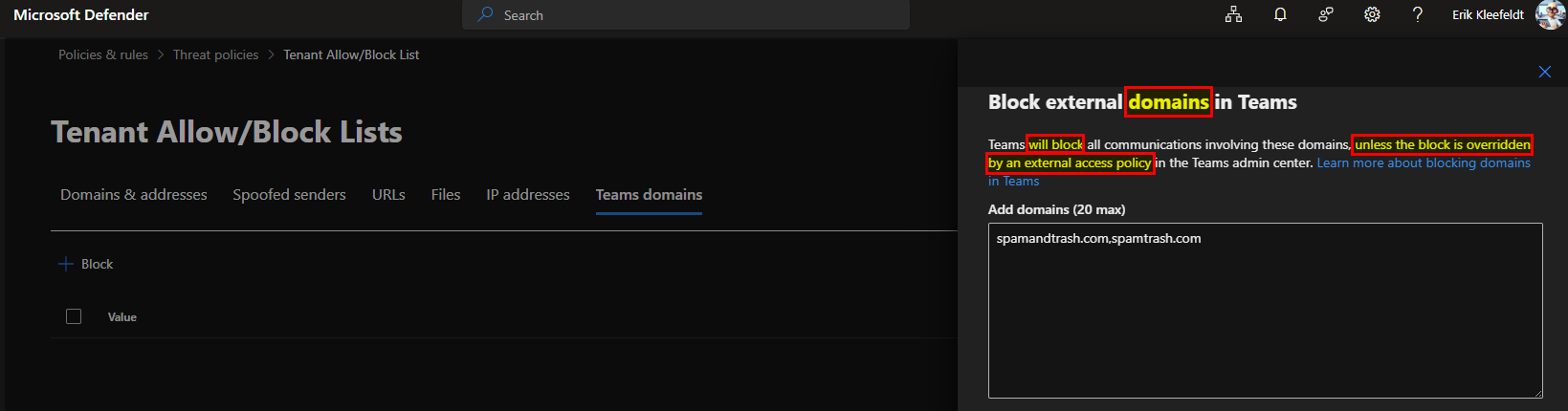Teams will block all communications involving these domains, unless the block is overridden by an external access policy in the Teams admin center.