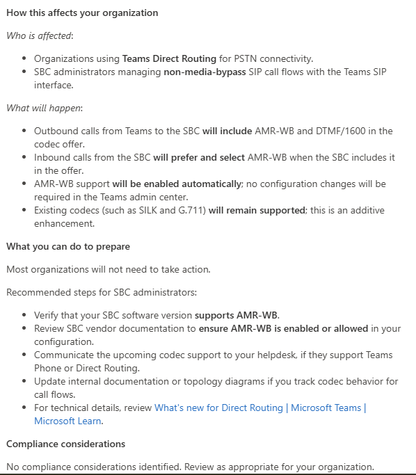 In this post I like to point out a recent message center notification tell us that the AMR-WB codec will be supported in Microsoft Teams Direct Routing deployments. It will be introduced and working in non-media-bypass VoIP calls (to/from public telephony network, PTN). Microsoft aims to start the rollout in March 2026 as mentioned in message center notification MC1234572.