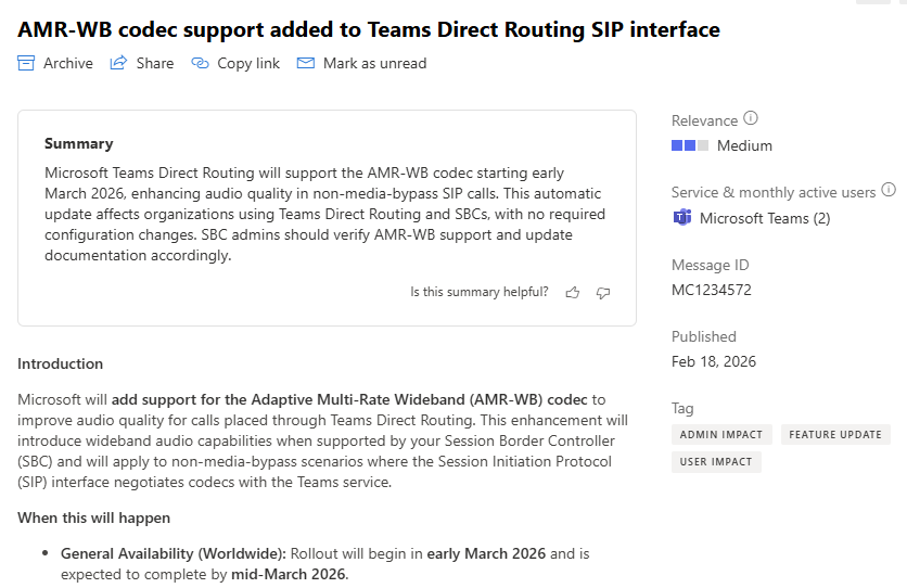 In this post I like to point out a recent message center notification tell us that the AMR-WB codec will be supported in Microsoft Teams Direct Routing deployments. It will be introduced and working in non-media-bypass VoIP calls (to/from public telephony network, PTN). Microsoft aims to start the rollout in March 2026 as mentioned in message center notification MC1234572.