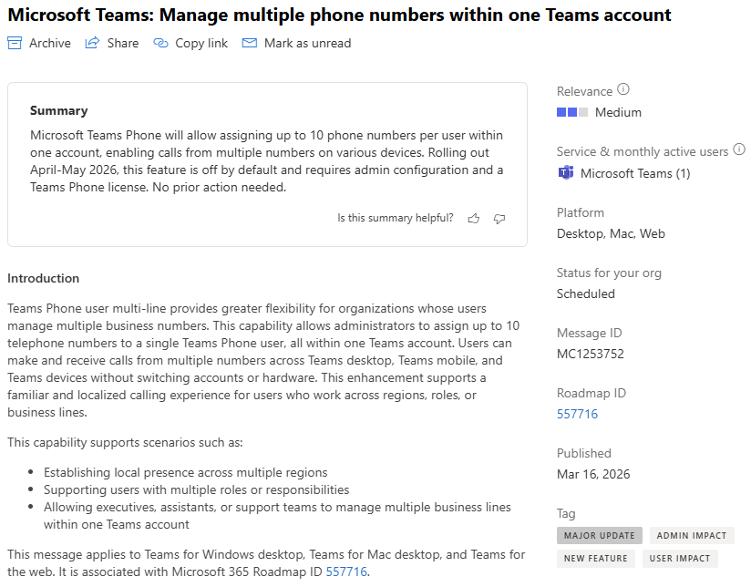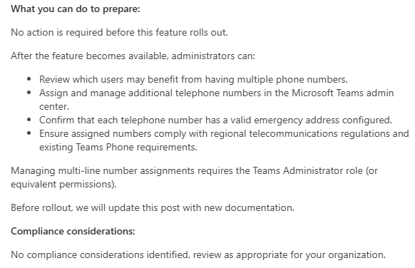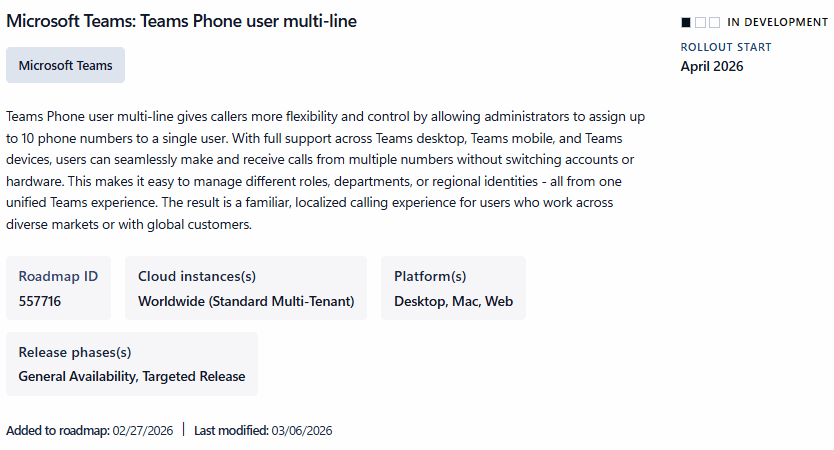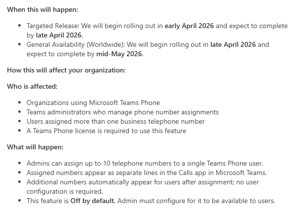 In this post, I would like to point you towards exciting news regarding Teams Phone and how many phone numbers can be assigned soon. Microsoft says it will add Teams Phone user multi‑line support, the capability to directly add several phone numbers to a single user. So no more workarounds? The rollout is scheduled to start in April 2026. Teams Calling Administrators will be able to assign up to 10 (ten!) phone numbers to a single Teams user. This enables users to make and receive calls from multiple numbers without switching accounts, devices, or hardware.