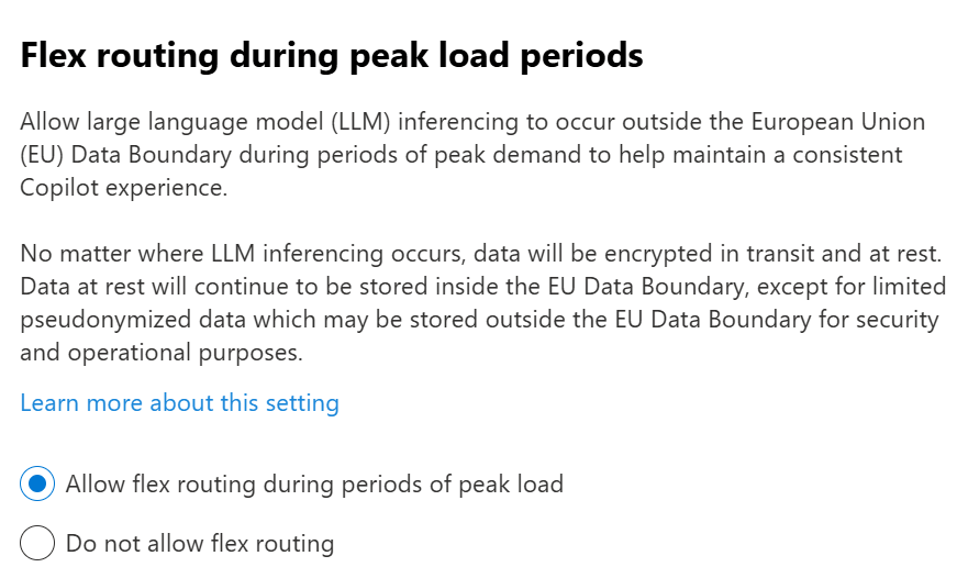 Flex routing allows large language model (LLM) inferencing to temporarily occur outside the EU Data Boundary during high-load periods as far as I understood. This should ensure performance stability and availability when demand spikes.