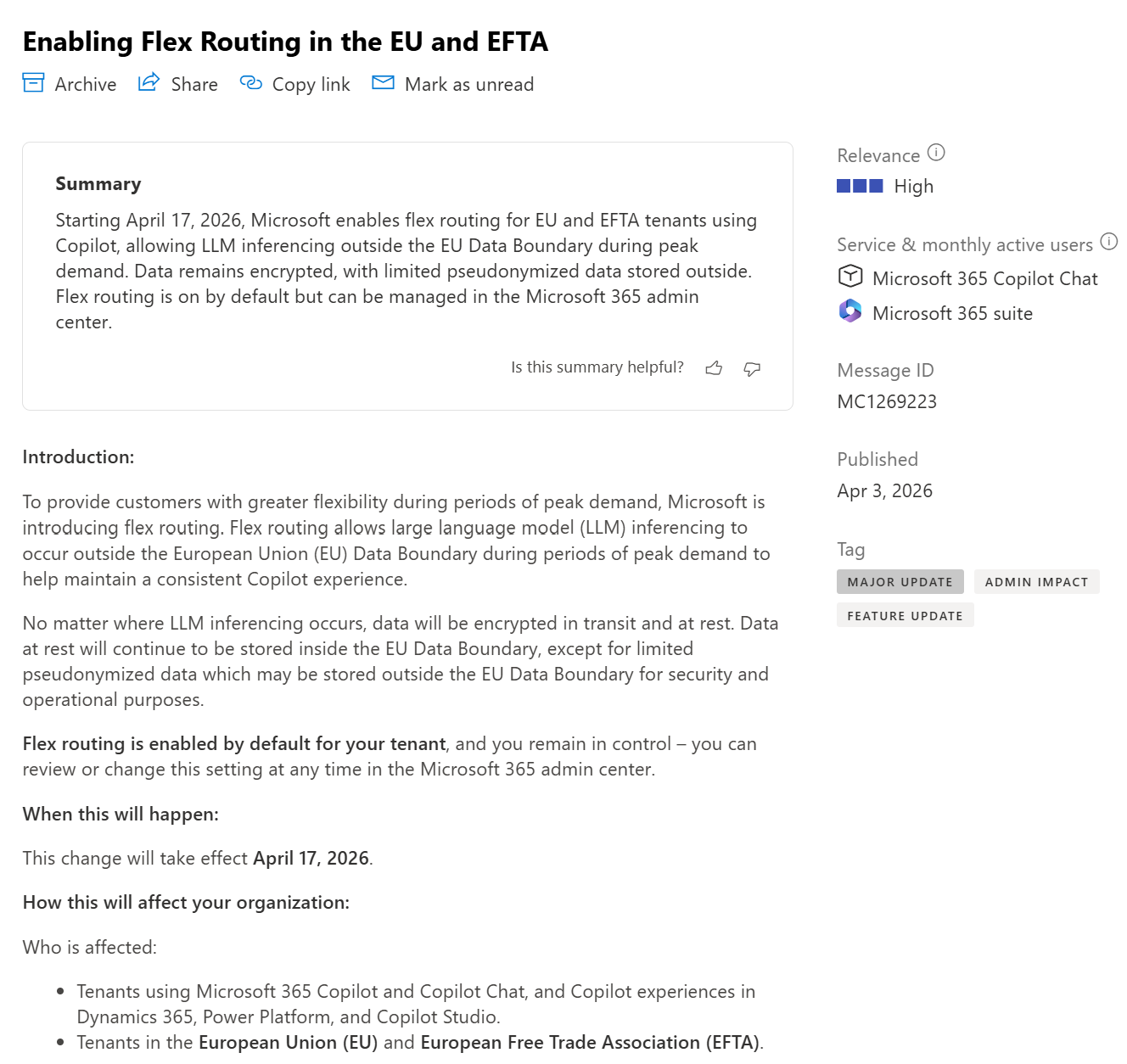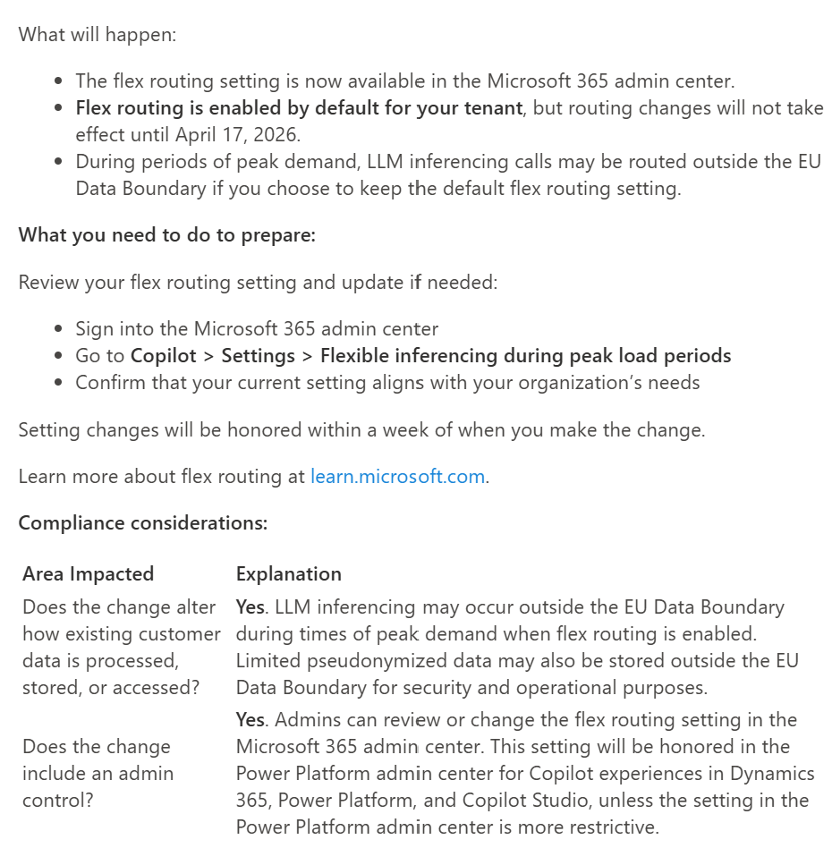 Did you read the recent announcement that Microsoft introduces flex routing for Copilot in case there is high demand to deliver answers in time and in quality in Copilot/s? Did you also read that this means that data (partially) could be routed outside for EU data boundaries in such phases of high load and demand in EU/EFTA data centers? The recent announcement showed up in the Microsoft Message Center as MC1269223.